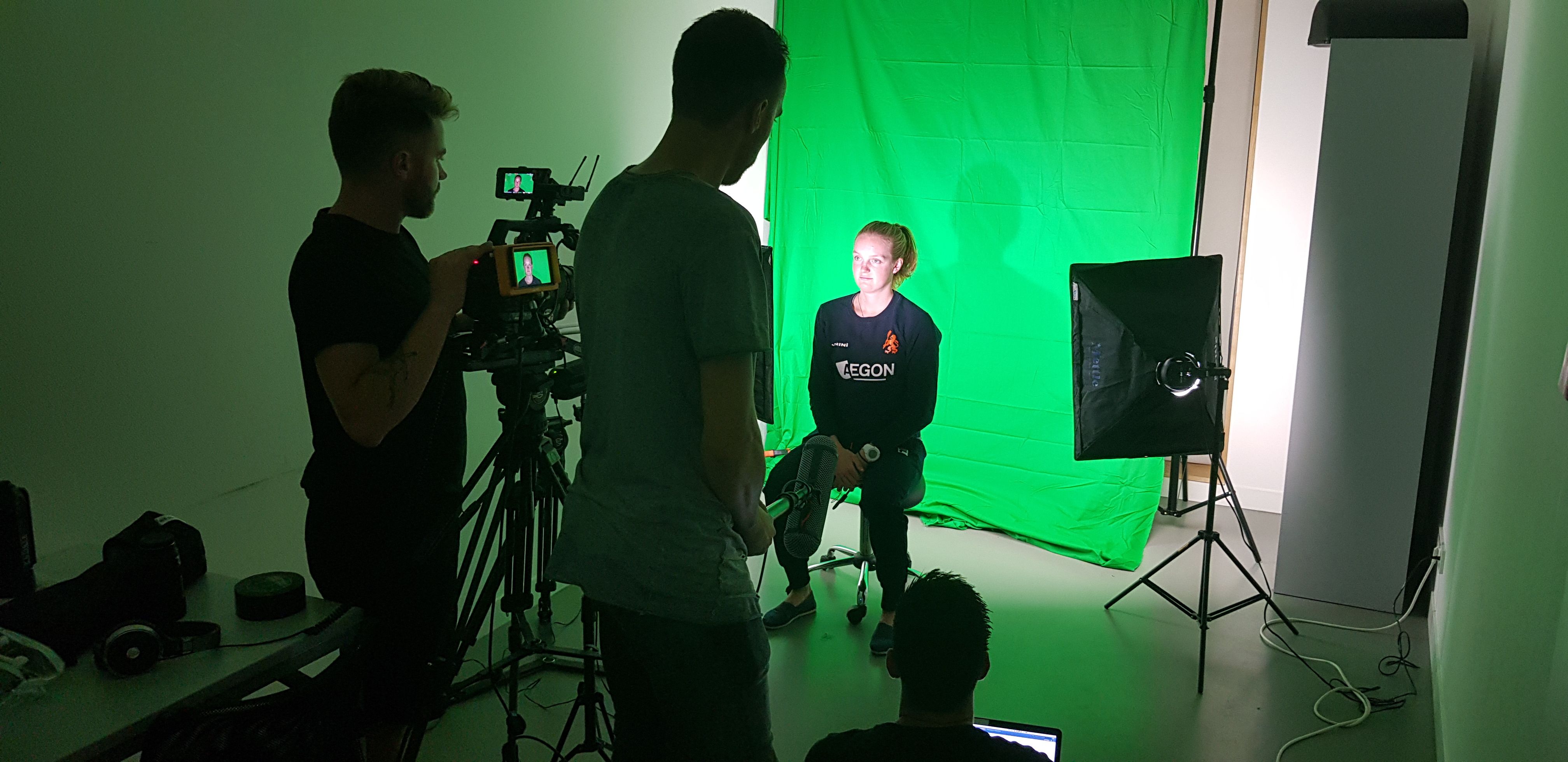 En zo zat ik enkele weken geleden dus in een benauwde massagekamer op het thuishonk van het Aegon Nationaal RoeiTeam. Felle lampen draaiden overuren. Marieke zat op een klein krukje, voor een groen scherm. De cameraman concentreerde zich op het shot, een collega stond met een grote geluidsboem en ik? Ik zat in kleermakershouding ernaast. Een shot voor de eeuwigheid, gelukkig heeft collega Richard er een foto van gemaakt, je ziet ‘m boven dit artikel.